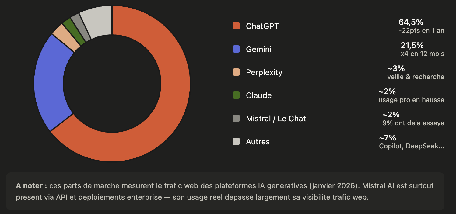 Sources : Statcounter / Incremys janv. 2026 — SE Ranking oct. 2025 — Havas Market / Ipsos fev. 2025 pour Mistral