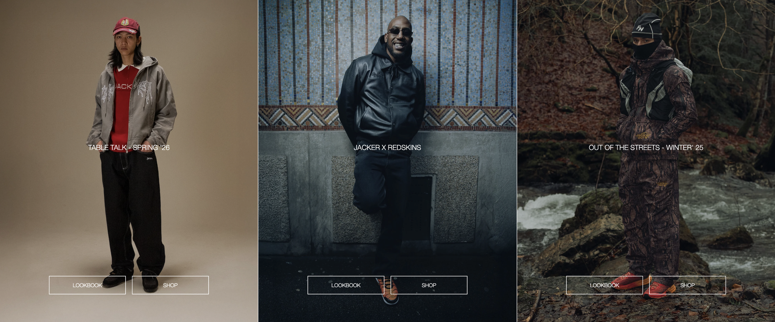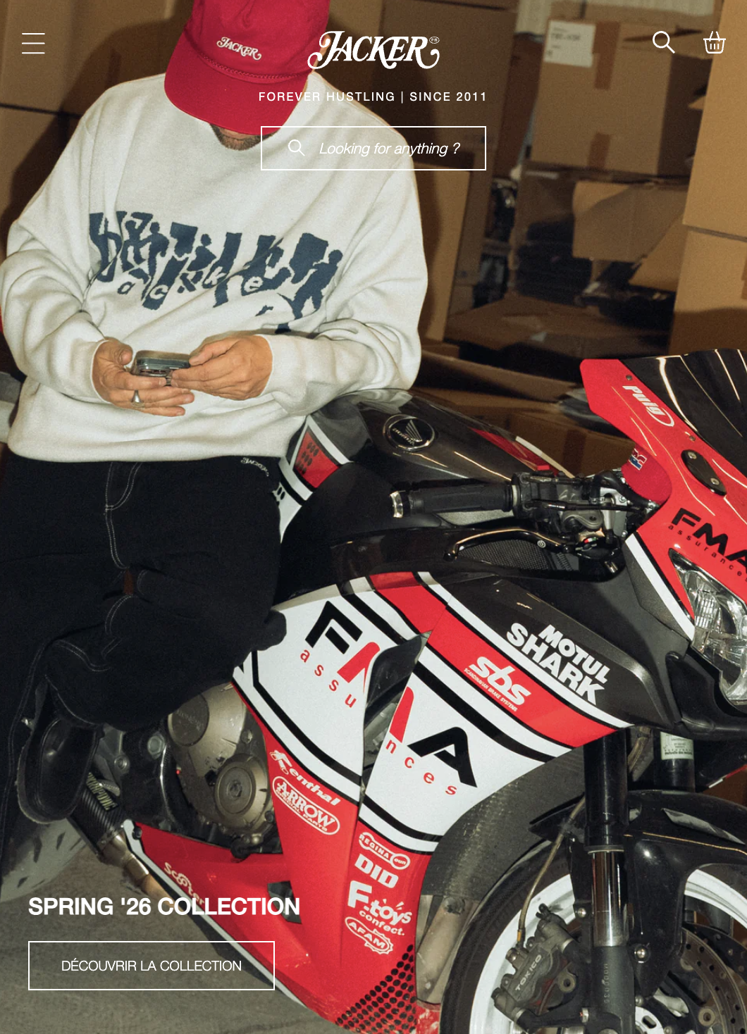 Aurélien Courbon, le fondateur de Jacker, avait une exigence claire : le site devait mettre en valeur la DA de la marque avant de vendre des produits. Pas de catalogue interminable, pas de homepage e-commerce classique. L'univers d'abord. Le reste suit.